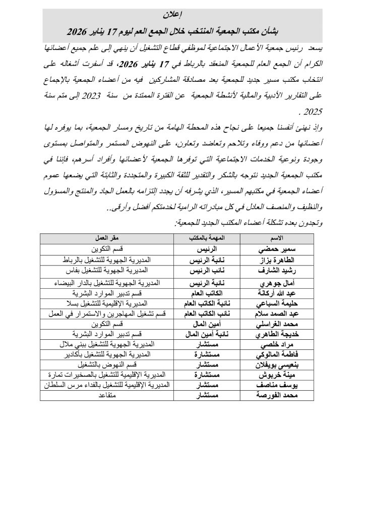 إعلان بشأن مكتب الجمعية المنتخب خلال الجمع العم ليوم 17 يناير 2026