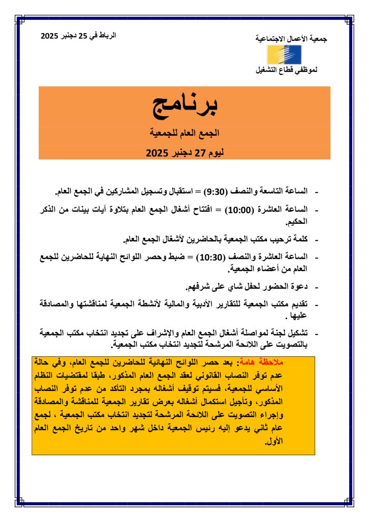برنامج الجمع العام للجمعية ليومه السبت 27 دجنبر2025