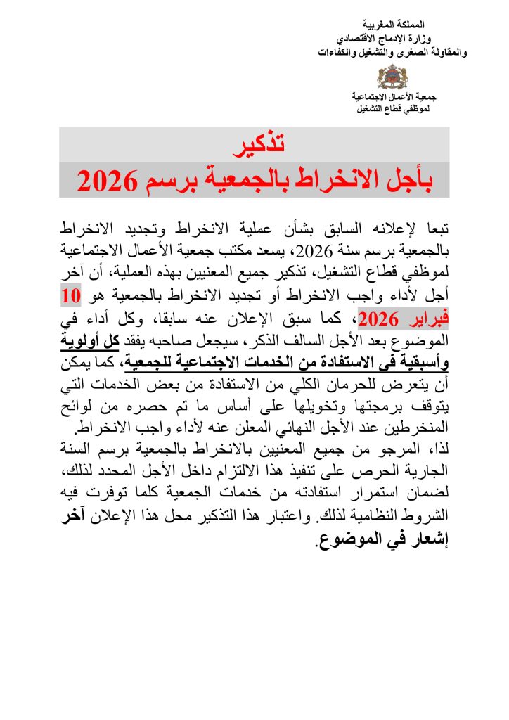 تذكير بأجل الانخراط بالجمعية برسم 2026
