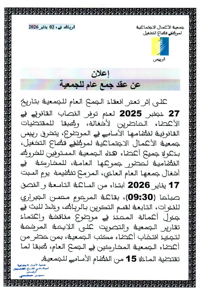الرئيسية / المستجدات / إعلان عن الجمع العام للجمعية بتاريخ 17 يناير 2026